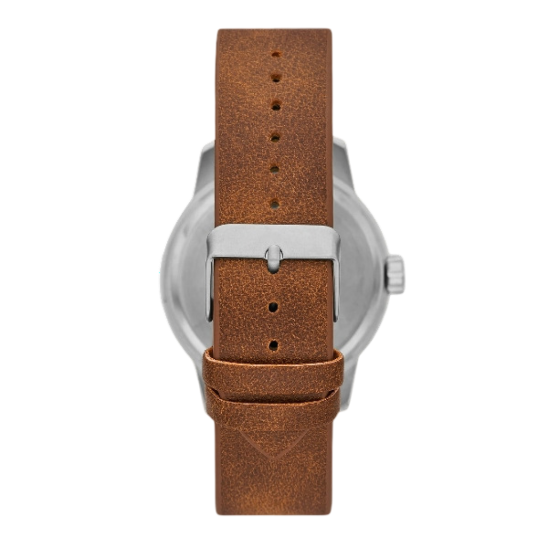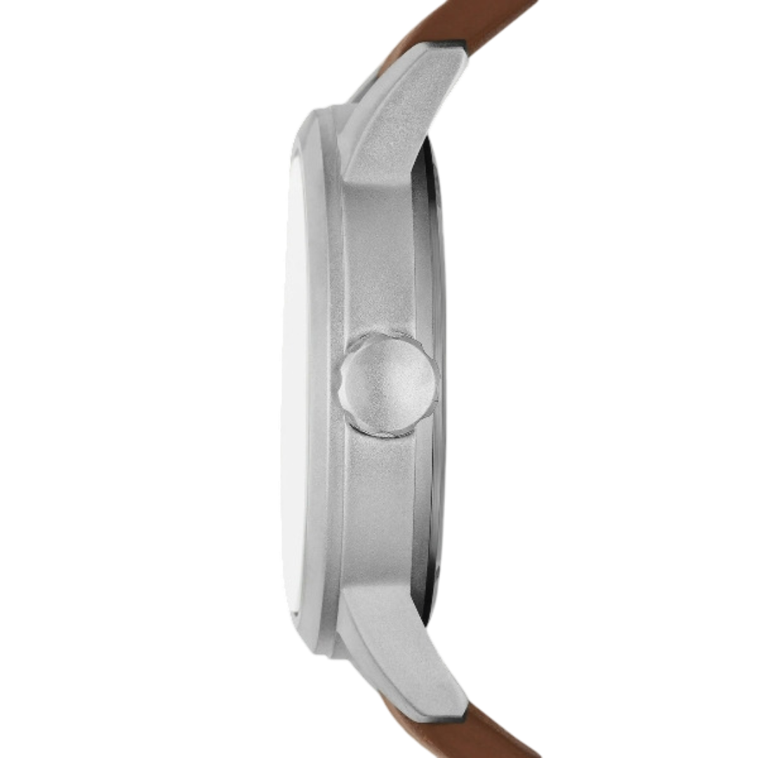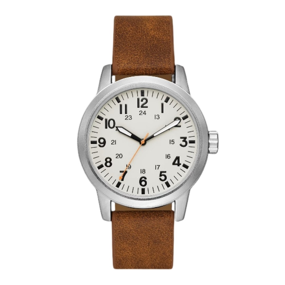 This stylish men’s watch blends rugged outdoor character with refined design. The matte silver-tone case pairs perfectly with the off-white easy-read dial, while the tan vegan leather band adds a touch of casual sophistication. A pop of orange on the second hand enhances the look with subtle personality, making it a versatile piece for both everyday wear and weekend adventures.