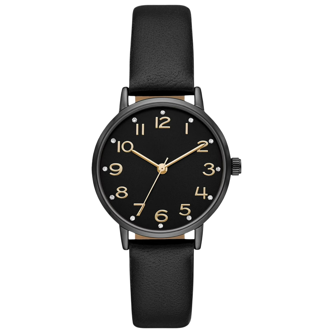 Elevate your everyday look with the refined elegance of this Gunmetal Crystal Accent Watch. The perfect balance of smoky black and gold tones creates a sophisticated, modern design. A smooth black faux leather strap pairs seamlessly with the gunmetal case and black dial, while gold-tone hands and sparkling crystal accents. Ideal for both casual wear and special occasions, this watch embodies timeless style and versatility.